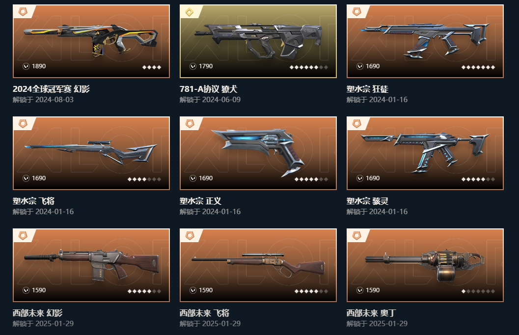 wegame无畏契约★ 刀皮数量17 枪皮数量163 限定38,光明哨兵2.0套装、塑水宗套装、西部未来套装、神中神罚套装,幻影-2024全球冠军赛,鬼魅-宿怨、鬼魅-胡桃狂想、鬼魅-光导纤维、鬼魅-耀鳞威龙、鬼魅-甜蜜战术,正义-游戏结束、正义-传奇制造、正义-塑水宗、正义-沙尘幻旅、正义-复古浪潮、正义-掠影、正义-西部未来、正义-日耀风暴